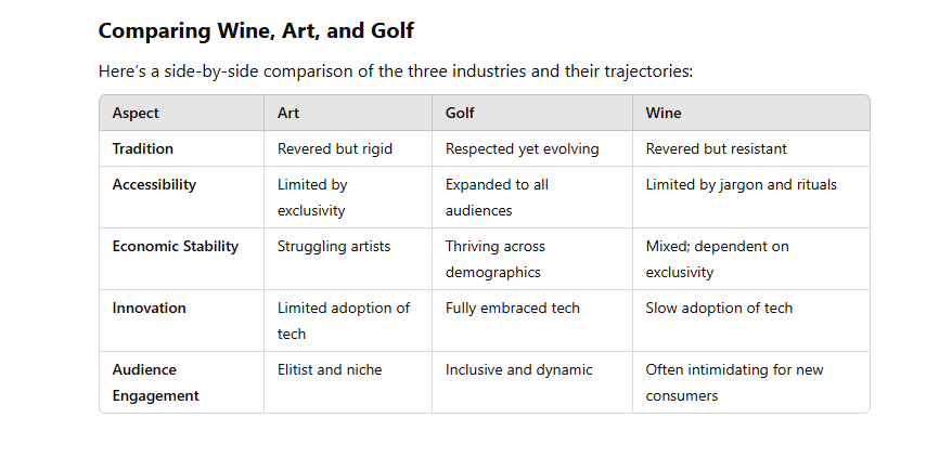This comparison highlights why golf’s evolution offers a better blueprint for wine than art’s struggles.
